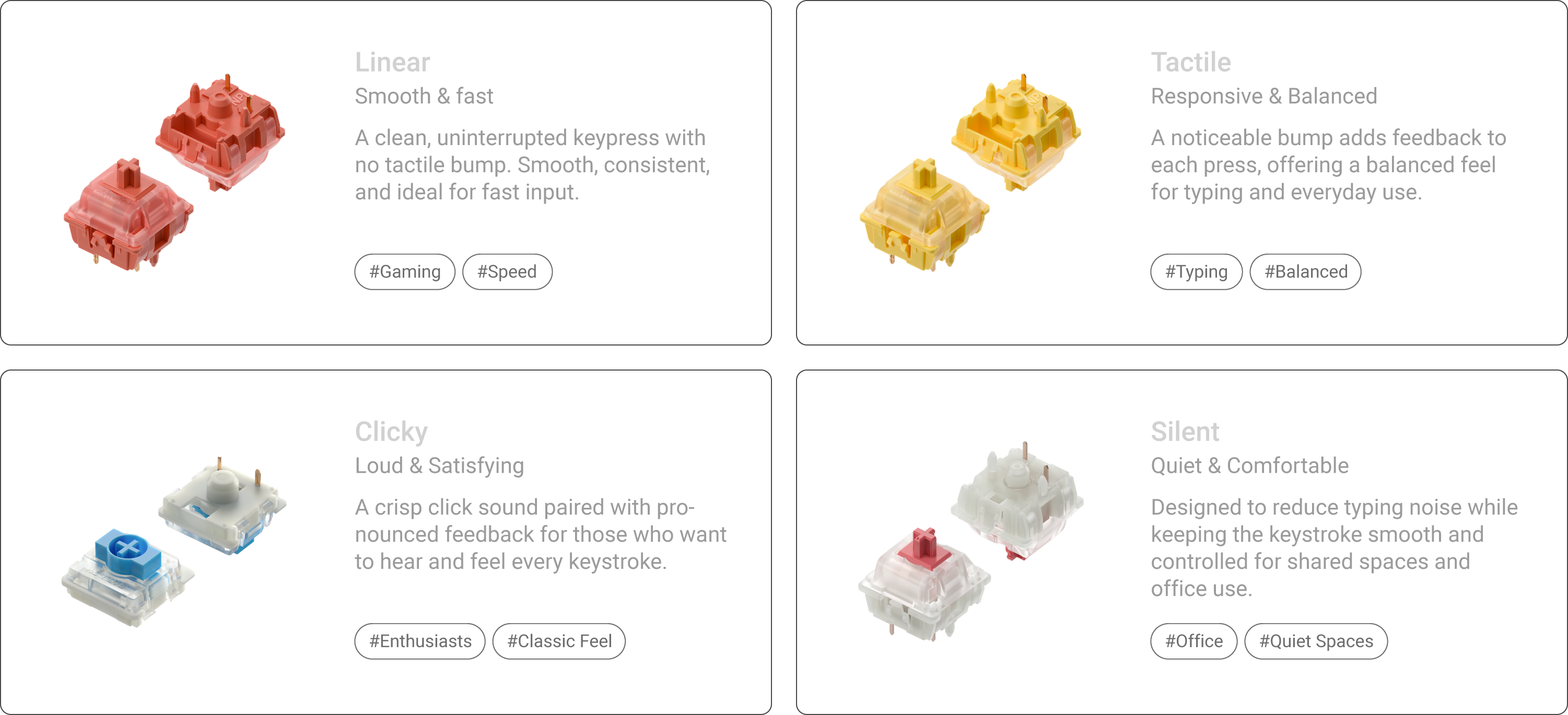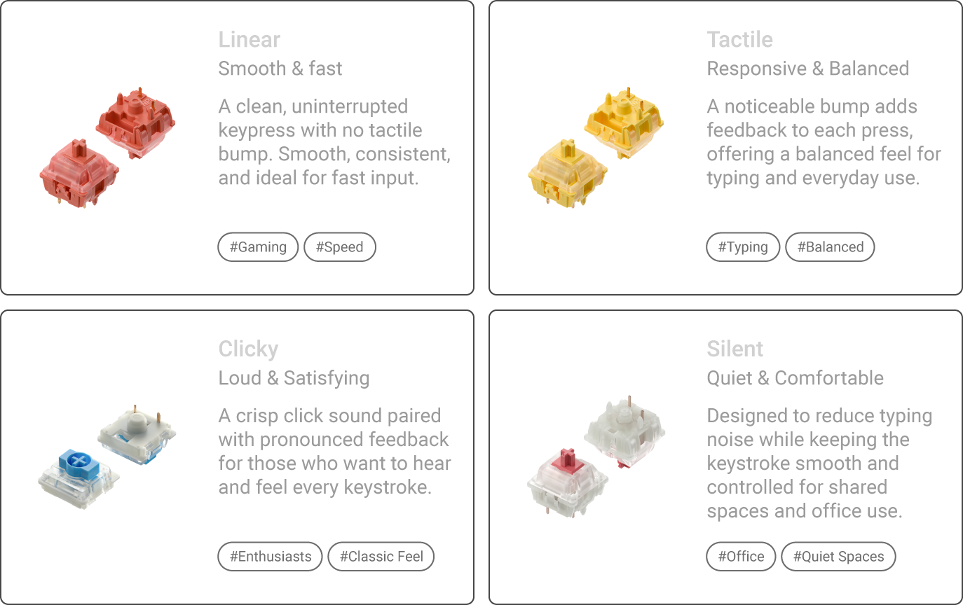 Linear, Tactile, Clicky, or Silent—Pick Your Rhythm.